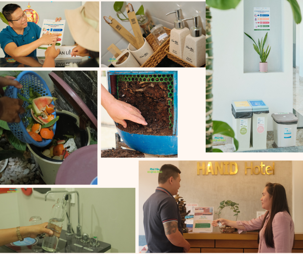 In the “Phu Yen for Zero Waste” project in which REED is the consultant for the component of “avoid single-use plastic” applied at hotels and local markets, we facilitated a process of co-designing solutions with the hotels in Phu Yen province. The integrated waste management solutions include at-source waste segregation, composting on site, move from single-use water bottles to refillable water stations in the properties, refillable amenity bottles and communications campaign with guests, connecting hotels with informal waste pickers. The approach helped reduce 2,8 items of single-use plastic products per guest during the pilot phase, and conversion rate of waste from landfill was 38%. The whole operation system of the hotels was trained and shifted with raised awareness and changing behaviours.