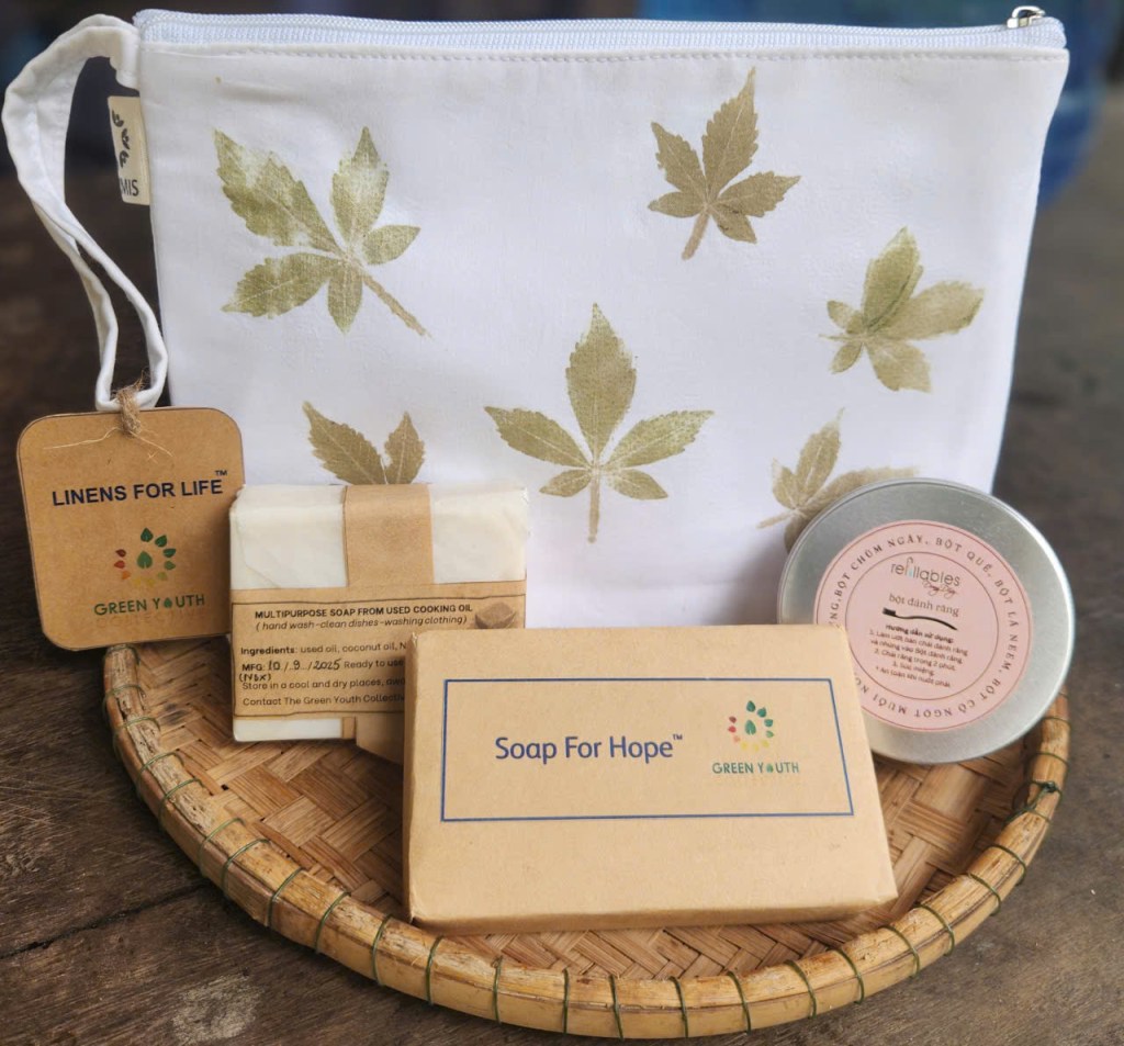 Green Youth Collective’s signature Zero Waste gift set. The mini-porch is made from discarded linens from luxury hotels (“Linens for Life”), soap bar remade from single-use soaps from luxury hotels (“Soaps for Hope”), hand-soap made from used cooking oil, refillable tooth powder using natural ingredients by Refillables Dong Day.